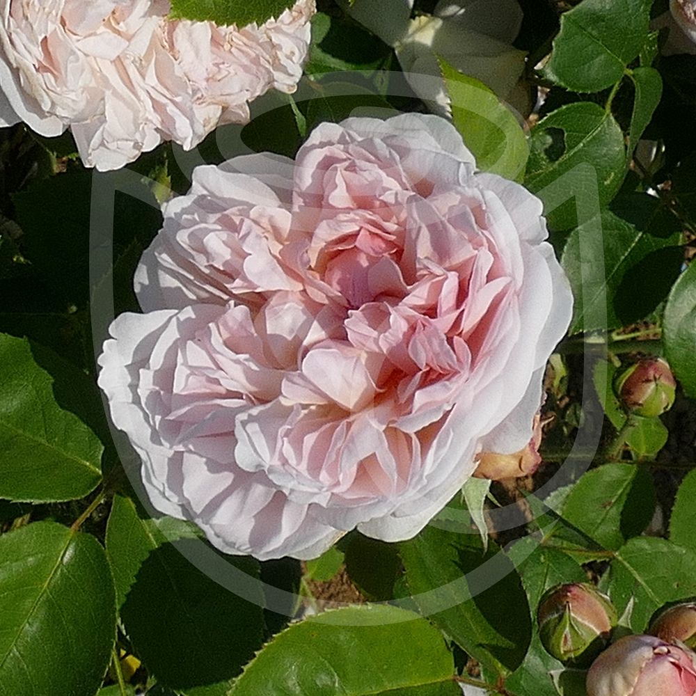 Rose tendre pur, et abondant feuillage vert soutenu.